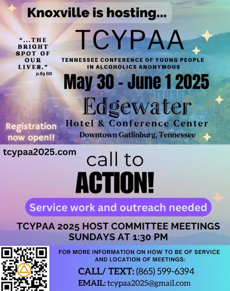 In 1983, the Tennessee Conference of Young People in Alcoholics Anonymous (TCYPAA) was founded for the purpose of furthering the principles of AA among young people. The Conference is a joyful weekend of sharing experience, strength, and hope among the young and young at heart in AA. It is held annually, typically in February. Any young people of AA who wish to bid should present a bid packet meeting each of the Bidding Requirements at the next conference. Bid packets are submitted on Friday night at the Conference, and bid presentations are given on Saturday morning. The Advisory Council decision on where the next year’s TCYPAA will be held is announced after the speaker meeting on Saturday night. Please share this invitation and the bidding requirements with all the young people in AA in your area! Don’t hesitate to Contact Us with any questions! Please consider bidding for TCYPAA. The young people of AA in Tennessee need you!